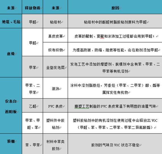 车内的这些异味到底是怎么产生的?仔细翻看车内的各个角落,发现能产生这类异味的污染源还真不少。汽车内饰中大量使用塑料、橡胶、织物、油漆涂料、保温材料和粘合剂等材料,这些材料中含有的有机溶剂、助剂、添加剂等成分在汽车使用过程中会逐渐释放到车内环境,造成空气污染。